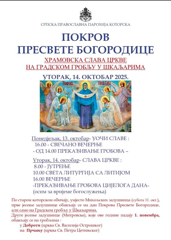 У понедјељак, 13. октобра уочи славе, Свечано вечерње служиће се у 16 часова....
