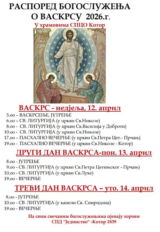 РАСПОРЕД БОГОСЛУЖЕЊАO ВАСКРСУ 2026. У ХРАМОВИМА...