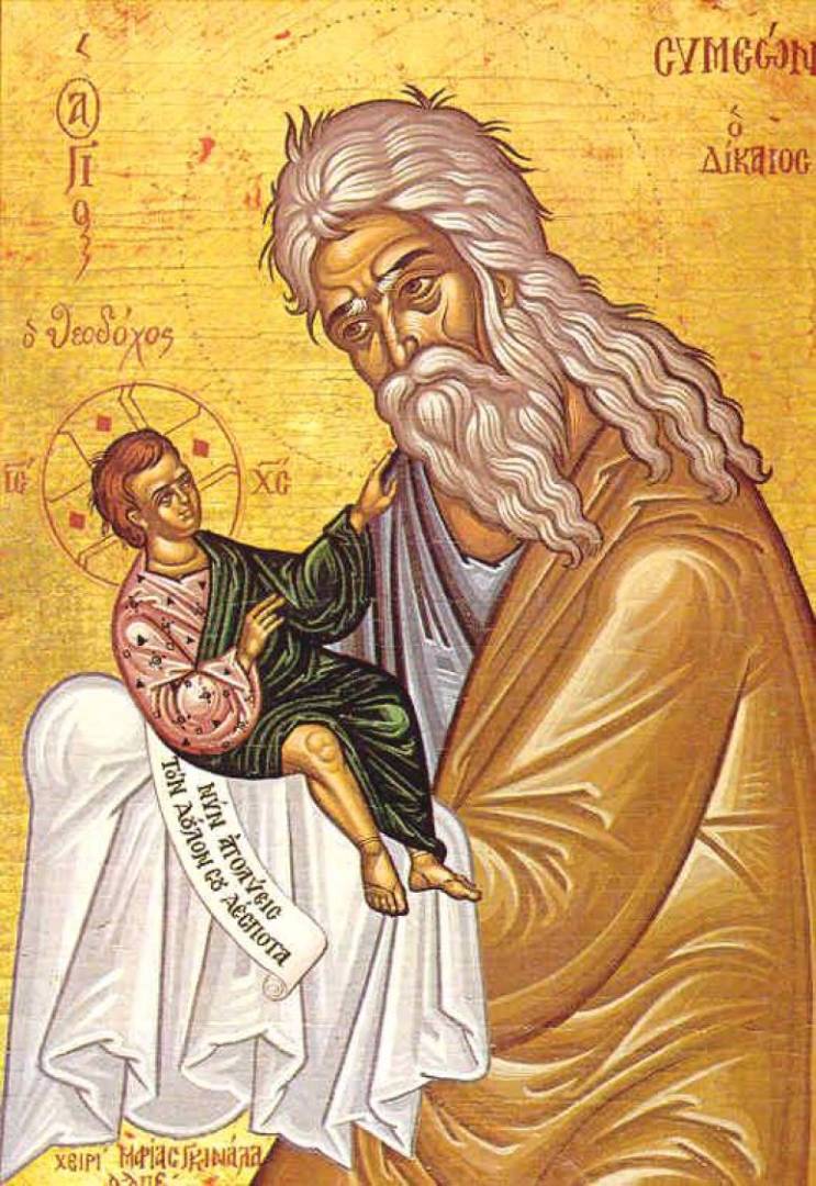 Када је Симеон, као један од Седамдесеторице, преводећи пророка Исаију са јеврејског на грчки дошао до: „Ево, дјева ће затрудњети и родиће сина“, узе нож да избрише реч „дјева“ и замени је са „млада жена“. Тада му се јави ангел који му објасни да је пророчанство истинито, у шта ће се и сам уверити јер неће умрети док не види Месију рођеног од Деве. Када Дева Марија донесе Богомладенца у храм јерусалимски, Симеон дође и рече: „Сад отпушташ у миру слугу својега, Господе, по ријечи својој, јер видјеше очи моје Спасење твоје“ (Лк. 2, 29-30). Убрзо се упокојио. Свети Симеон је заштитник мале деце. Ту је била и пророчица Ана, старица од 84 године, која је такође познала Месију и објавила га народу.
