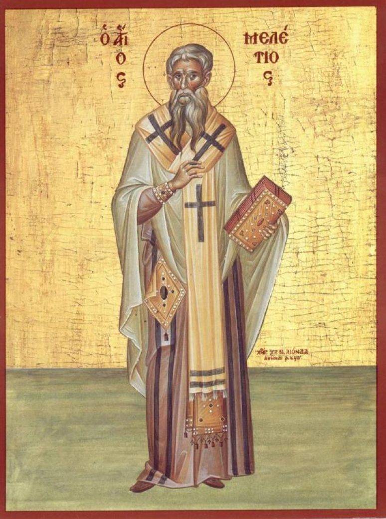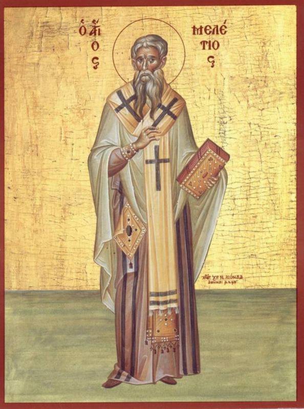 Читав свој живот посветио је борби против Аријеве јереси. Са архиепископског тона јеретици су га три пута прогонили у Јерменију. Једном, док народу говораше о Светој Тројици, његов ђакон, јеретик, затвори му уста шаком и он настави говорити знацима. На II Васељенском Сабор Бог је кроз њега пројавио следеће чудо: Док је Аријевцима доказивао догмат Свете Тројице, диже три прста раздвојено, па када их склопи уједно из његове руке сину светлост као муња. На овом Сабору Свети Мелетије утврди Светог Григорија Богослова на цариградском престолу. Раније је зађаконио Светог Василија Великог и крстио Светог Јована Златоуста. Упокојио се у Цариграду, по завршетку Сабора. Мошти су му пренете у Антиохију.
