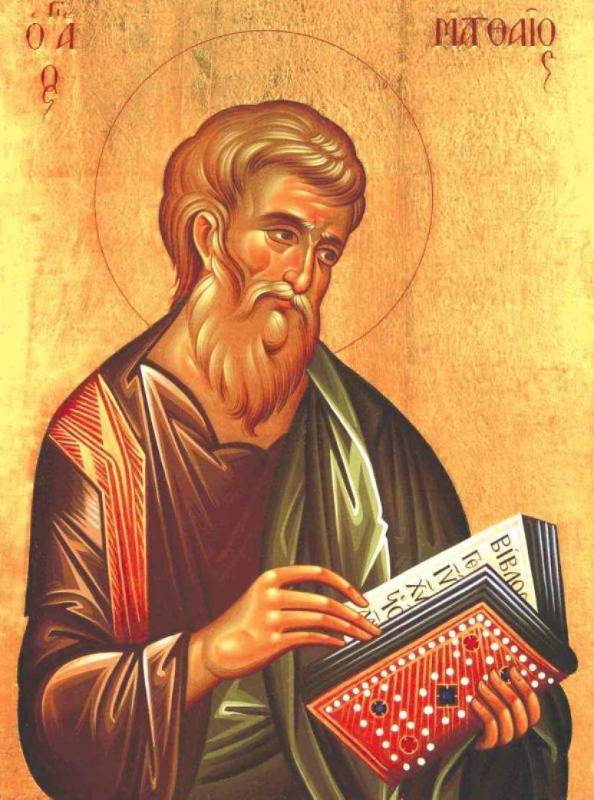 Цариник, син Алфејев. Господ га у Капернауму позвао: „Хајде за мном. И уставши отиде за њим“ (Мт. 9, 9). Проповедао је Јеванђеље у Партији, Мидији и Етиопији, где је за епископа поставио Платона, а он се повукао у пустињу. Када је крстио жену и сина кнеза те области, овај се расрди. Једна стража чу Апостола, али га не виде, друга заслепе, те кнез оде за њега, али ослепе од јаке светлости. Светитељ му врати вид, али овај га ухвати. Није могао да га убије све док се Апостол није помолио Богу да му узме душу. Касније се кнез раскаја, прими чин свештеника и када се епископ Платон упокојио Свети апостол Матеј га постави на епископски трон. Свети Матеј је написао Јеванђеље, на јеврејском језику.
