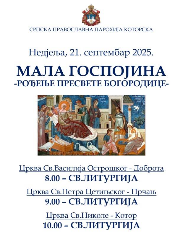 МАЛА ГОСПОЈИНА-РОЂЕЊЕ ПРЕСВЕТЕ БОГОРОДИЦЕ - Недјеља, 21. септембар