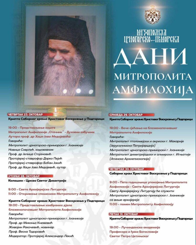 Митрополија црногорско-приморска организује Дане Митрополита Амфилохија који почињу у четвртак, 23. октобра у крипти Саборног храма Христовог васкрсења у Подгорици промоцијом књиге „Митрополит Амфилохије Отачник – Духовни азбучник, аутора проф. др Јова Медојевића.