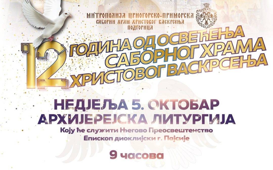 У недјељу 5. октобра отпочеће прослава дванаесте годишњице од освећења Саборног храма Христовог васкрсења у Подгорици. Поводом прославе, Свету архијерејску литургију са свештенством и вјерним народом служиће Његово преосвештенство Епископ диоклијски г. Пајсије, са почетком у 9 часова.