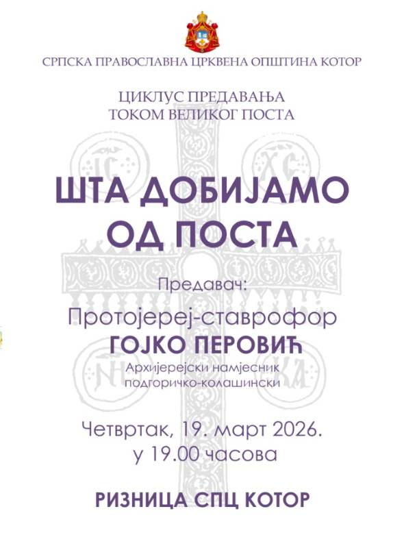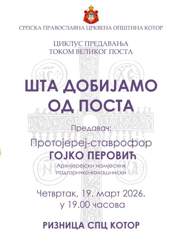 Тема предавања је „Шта добијамо од поста“, а организатор Српска православна црквена општина Котор .