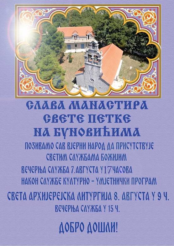 Манастир Свете Петке на Буновићима прославиће 7. и 8. августа храмовну...
