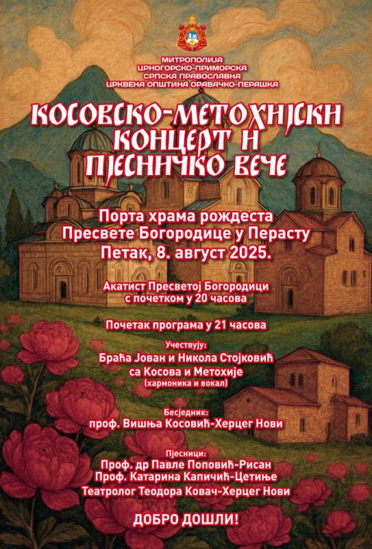 У организацији Црквене општине оравачко-перашке, у петак 8. августа, у Перасту...