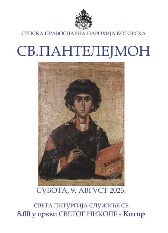 СВ. ПАНТЕЛЕЈМОН СУБОТА, 9. АВГУСТ 2025. СВЕТА ЛИТУРГИЈА СЛУЖИЋЕ СЕ У 8.00...