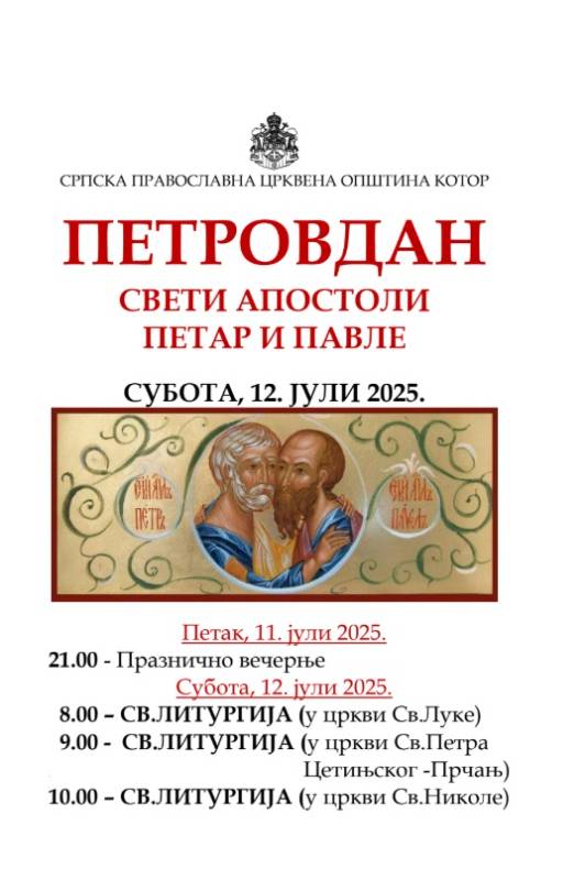 БОГОСЛУЖЕЊА ПОВОДОМ ПЕТРОВДАНА (СВЕТИ АПОСТОЛИ ПЕТАР И ПАВЛЕ)...