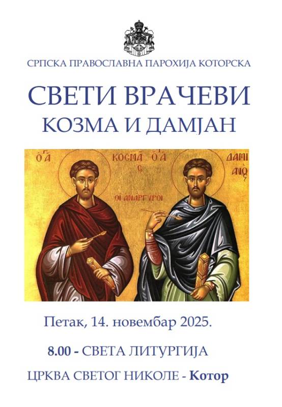 СВЕТА ЛИТУРГИЈА ПОВОДОМ ПРАЗНИКА СВЕТИХ ВРАЧЕВА КОЗМЕ И ДАМЈАНА, БИЋЕ СЛУЖЕНА У...