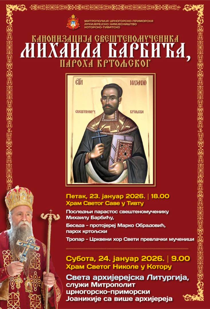 The solemn act of canonization of the Holy Hieromartyr Michael (Barbić), Parish Priest of Krtolj, will take place on Saturday, January 24, 2026, in the Church of St. Nicholas in Kotor at the Holy Hierarchical Liturgy, which will be celebrated by His Eminence Archbishop of Cetinje, Metropolitan of Montenegro and the Littoral, Mr. Joanikije, with several hierarchs, clergy, monks and faithful.