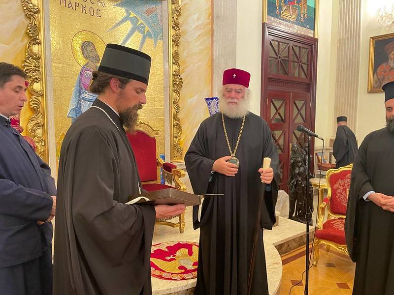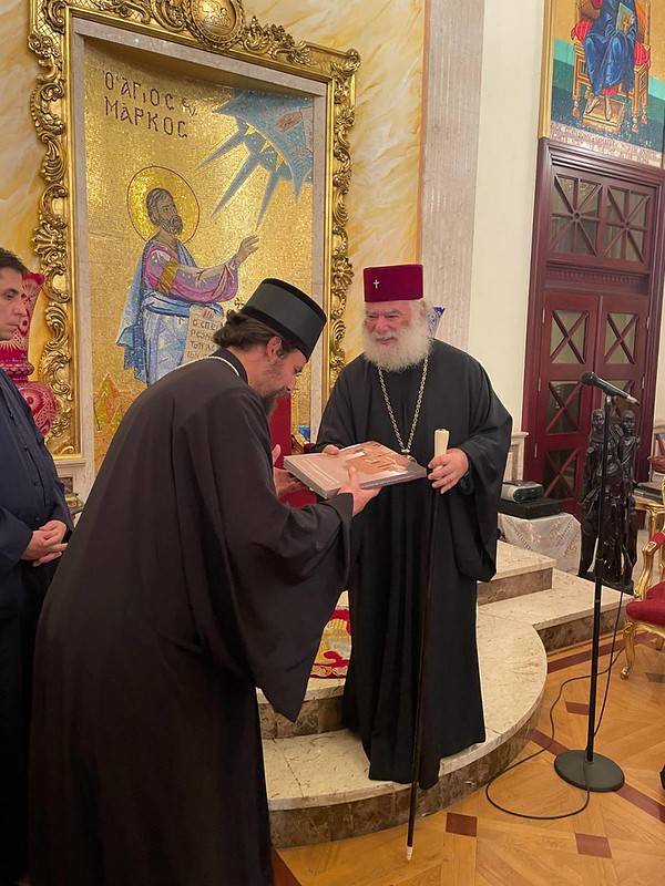 At the ceremonial reception on behalf of the delegation of the Metropolis of Montenegro and the Littoral and the Cetinje Theological Seminary, Patriarch of Alexandria Theodore II greeted His Eminence Bishop Paisios of Diocletia, also conveying the greetings of Metropolitan of Montenegro and the Littoral Joanikije.