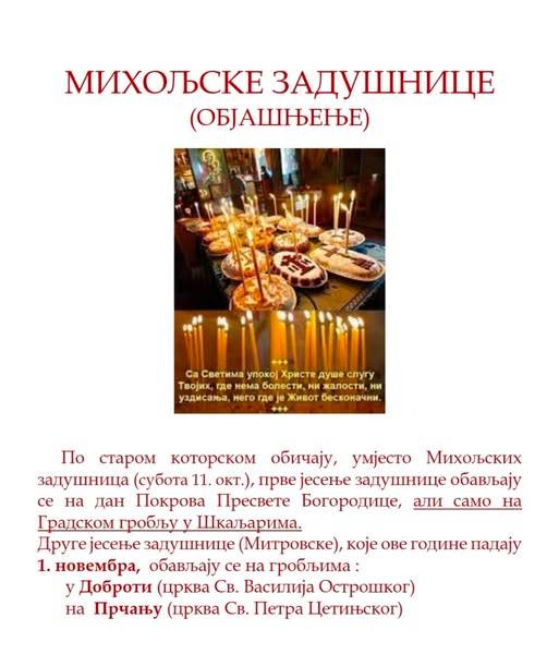 The second autumn All Souls' Day (Mitrovice), which this year falls on November 1, is held at the cemeteries in Dobrota (Church of St. Basil of Ostrog) and in Prčanj (Church of St. Peter of Cetinje).