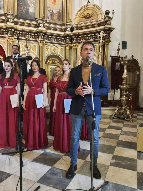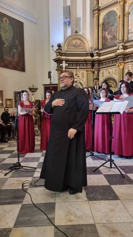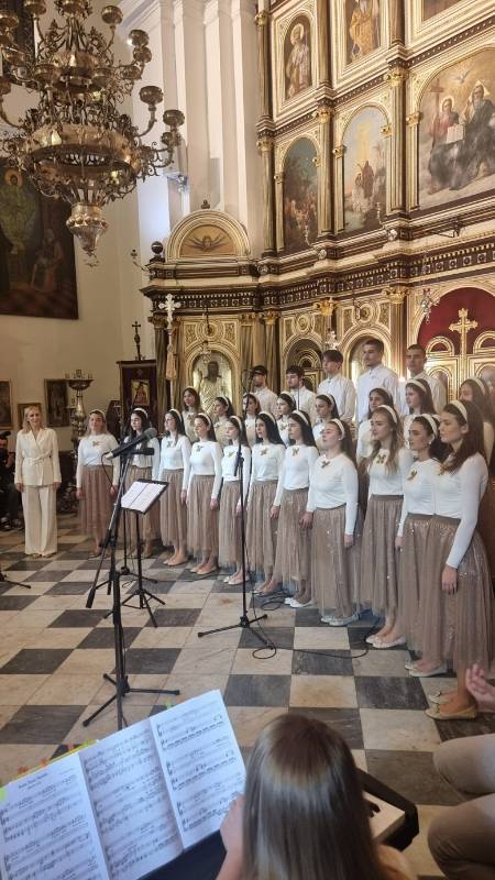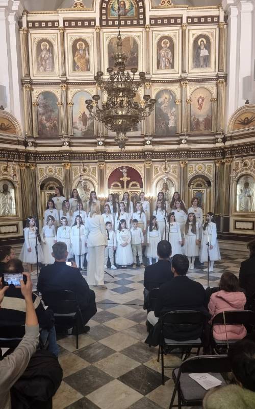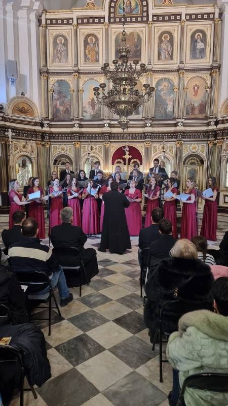 Na repertoaru mješovitog hora bila su djela: Mokranjca (Molitvami Bogorodici), Lazarevića (Spasi ni Sine Božiji), Bajića (Roždevstvo Tvoje Hriste Bože naš), Arhangelskog (Ninje Otpuščaješi), Pščednika (Dostojno jest), Jonatana (S nami Bog), Bajića (Slava vo višnjih Bogu), kao i ruski tradicionalni napjevi.