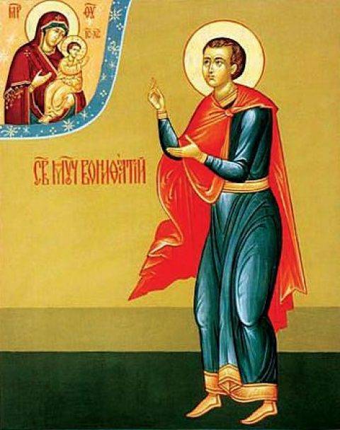 Kao mladić, bio je sluga kod bogate i razvratne Rimljanke Aglaide, sa kojom je imao nečiste veze. Ona ga posla u Aziju da joj donese mošti nekog mučenika, da ih ima kao amajliju u kući. Ali Bonifatije u Tarsu, videvši hrišćanske mučenike: jednome odsečene noge, drugome ruke, trećeme izbodene oči, četvrte na vešalima…, pokaja se zbog svog grešnog života, gorko zaplaka i viknu sudiji da je i on hrišćanin. Nakon što su ga šibali, nalili su mu olovo u usta, da bi ga na kraju posekli mačem. Sveti Bonifatije je postradao za Hrista 290. godine. Primivši Bonifatijevo telo, Aglaida sagradi crkvu u koju položi njegove mošti, i sama se pokaja i, razdavši sve svoje imanje siromasima, povuče se iz sveta.