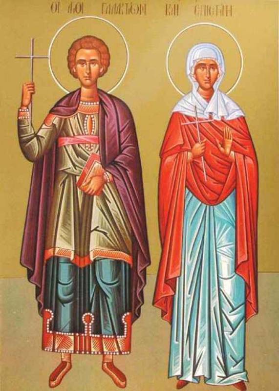 Rodom iz Edese, u Finikiji. Galaktionova majka Levkipija bila je nerotkinja dok nije krštena. Potom i muža privede Hristu. Kada mu se majka upokojila, Galaktiona otac veri sa devicom Epistimom, ali on nju usavetova da se krsti pa onda i zamonaši. Potom su otišli u planinu Puplion, on u muški, a ona u ženski manastir, i oboje se pokazaše velikim podvižnicima. Nisu izlazili iz manastira, niti su se videli do pred smrt. Kada su ih izveli na sud, dok su Galaktiona šibali, Epistima je plakala, pa su i nju stavili na muke. Potom su im odsekli ruke, pa noge i na kraju glave. Sahranio ih je Evtolije, rob Epistiminih roditelja, pa monah sa Galaktionom, koji napisa njihovo žitije. Postradali su 253. godina.